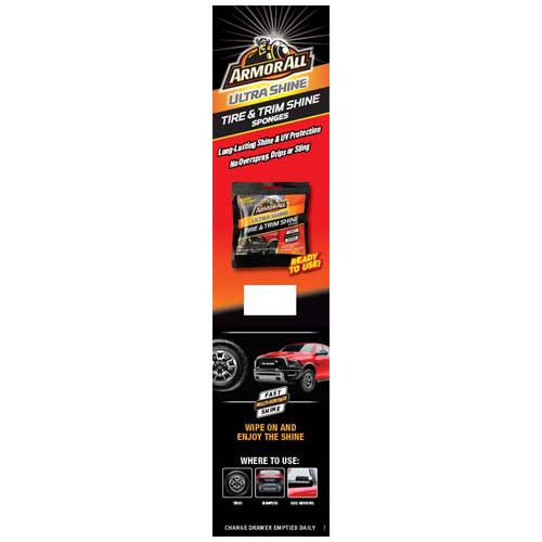 Adding Armor All Tire & Trim Shine Sponges to your vending machine? This bright and colourful decal shows which Armor All vending products you have for sale.