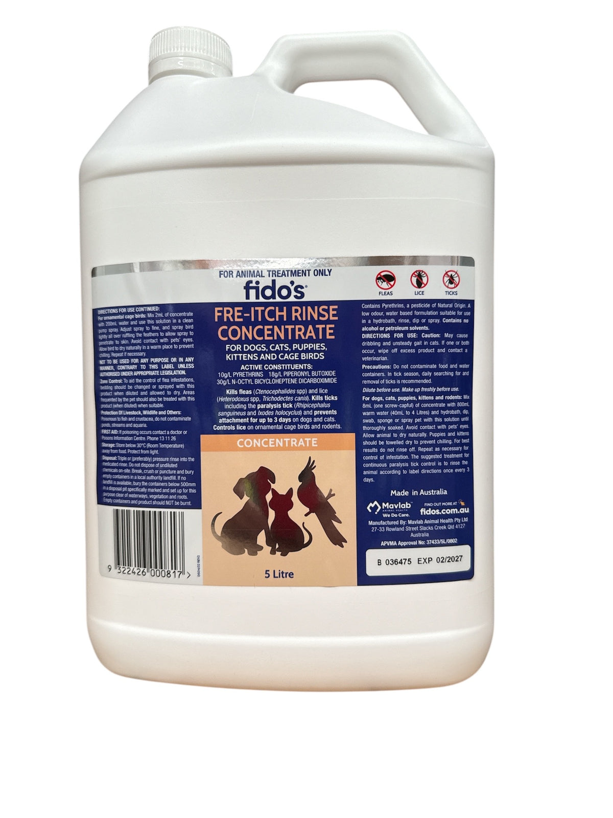 A pyrethrin based leave in wash for use on dogs, cats, puppies, kittens, cage birds and rodents. Kills fleas, lice and ticks including the paralysis tick and prevents attachment of the paralysis tick for up to 3 days.