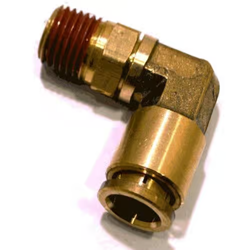 This 90-degree elbow has a 3/8" push-in tube connection at one end and a 1/4" MNPT swivel connection on the other. Self-contained assembly with Buna-N O-rings standard, no loose parts that could get lost.